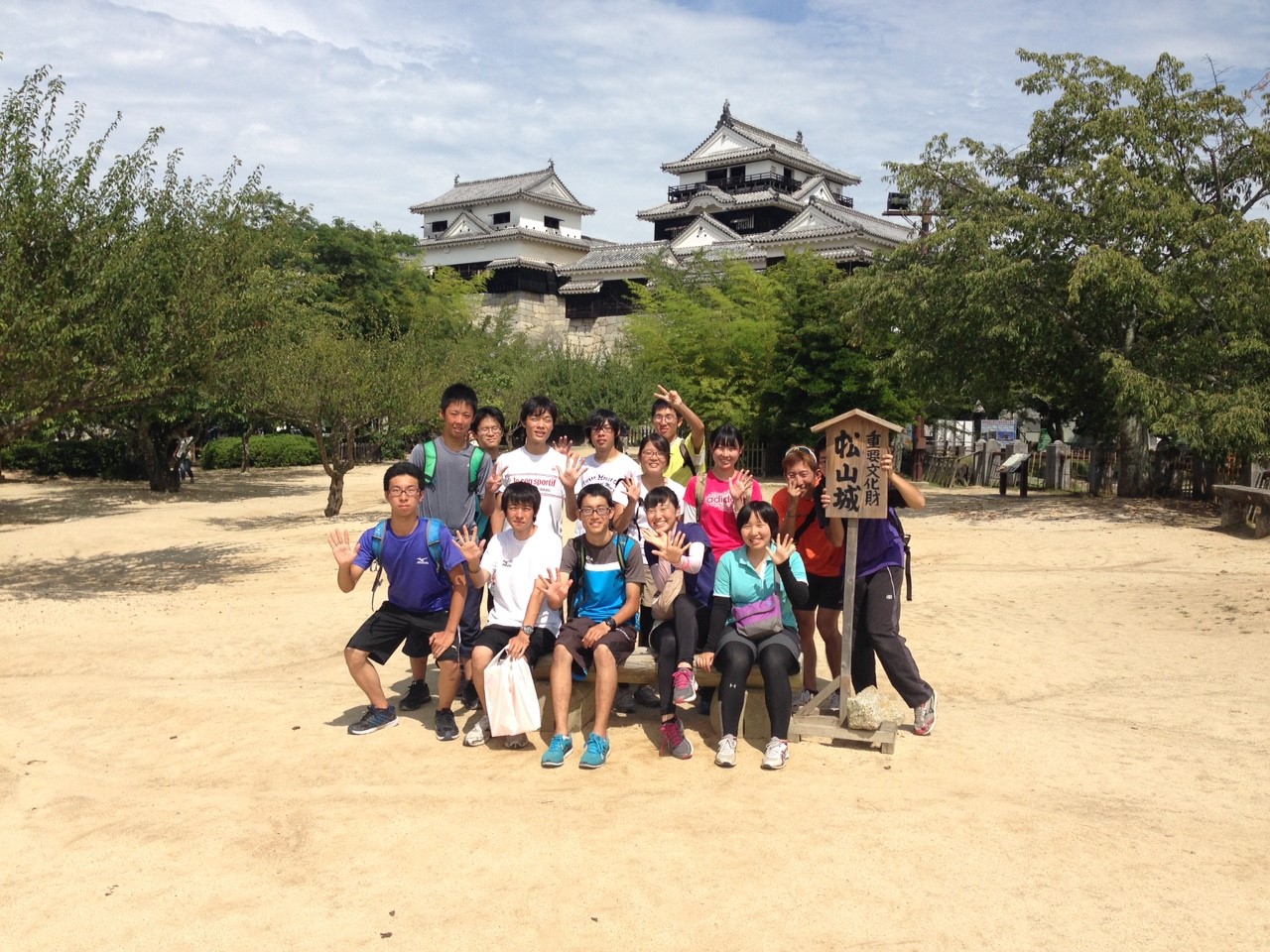 まずはキャンプ場から松山城へ!!!松山、大都会でした。自動車、歩行者の通行の妨げにならないよう、マナーを守って走行しました。