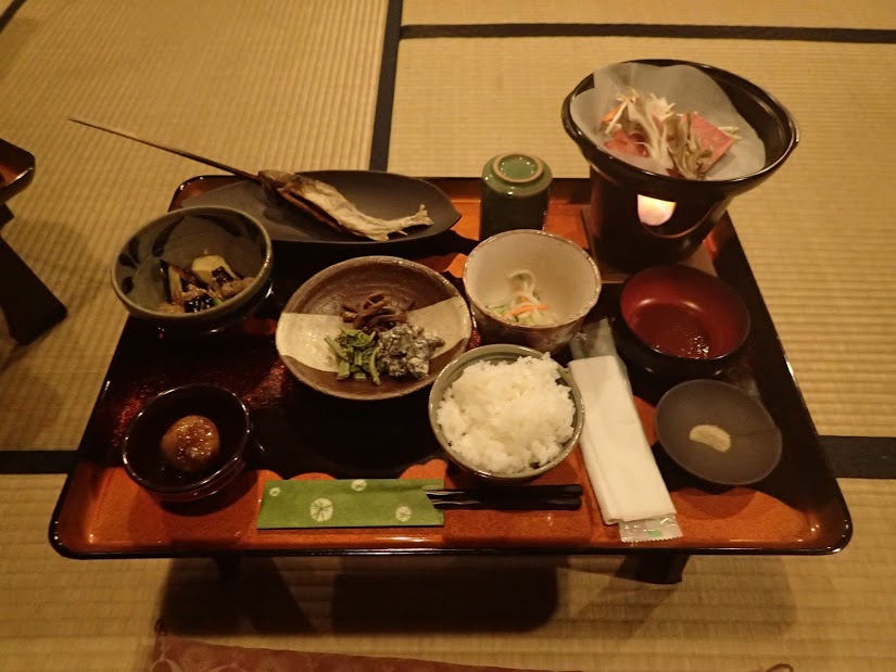 夕食は山間の地域らしい食材を活かした料理でしたね。その地域の特色ある食べ物を食べられるのはやっぱり旅の醍醐味ですよね。私は肉と野菜を朴葉でつつんで味噌と焼く、朴葉みそがお気に入りでした。お膳右上の料理です。