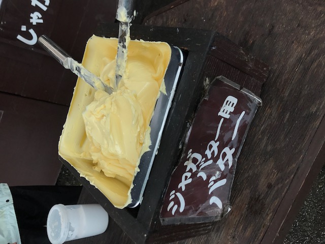 霧ケ峰高原の道に駅でいったん休憩!!もう寒くて寒くて仕方なくて、とりあえず何か食べよう!というわけでソフトクリームにおやきにじゃがバターに、と豊富なメニューからそれぞれ好きな物を選びましたが、もっとも衝撃だったじゃがバターがこちら。