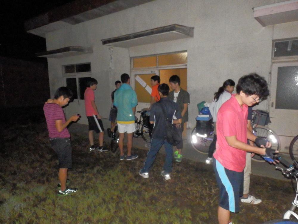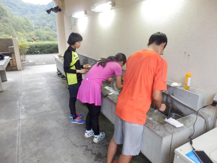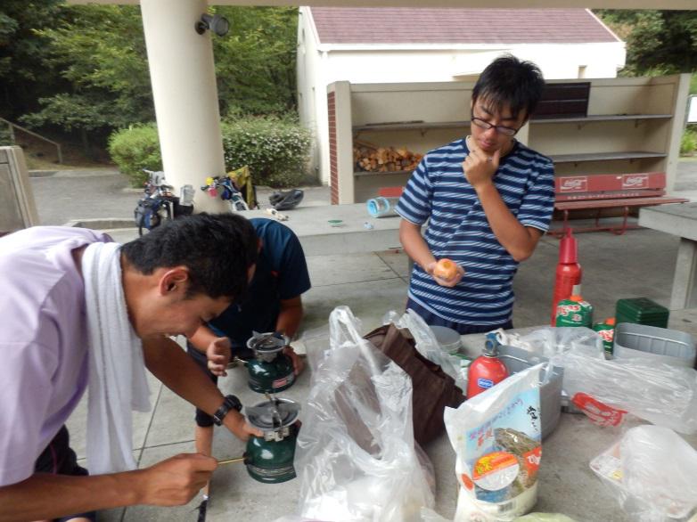 夜はキャンプ場の炊事場で合宿の定番,カレー。炊事場は利用料500円。食後に休憩する二年生。