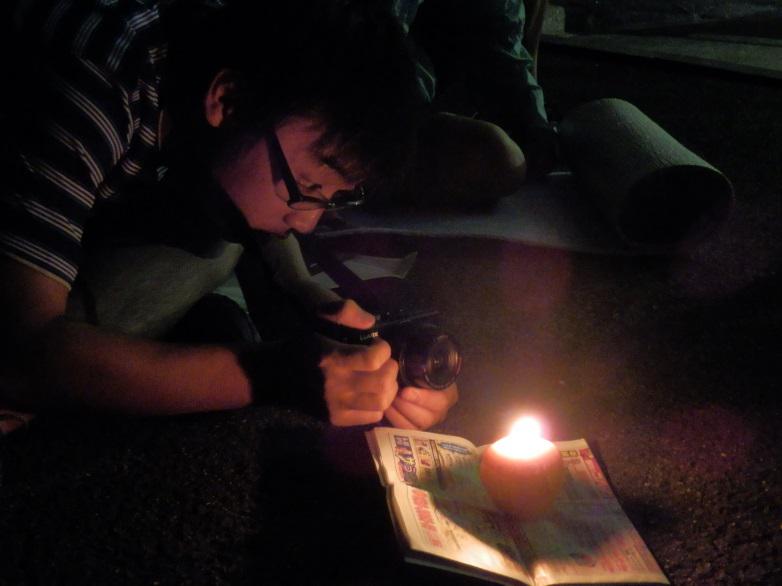 夜は蛍光灯にあまりに虫が集まるのでOBからの差し入れにあったキャンドルの灯りの下で夕食。こんな場面で役に立つから一見邪魔な差し入れも侮れない。