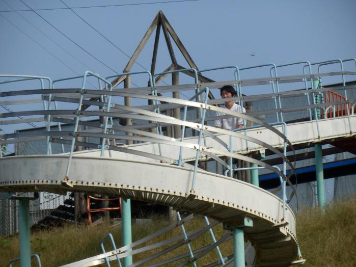 買い物と洗濯を済ませてキャンプ場へ。この日のキャンプ場,「美濃田の渕キャンプ場」は近くにサービスエリア,コンビニがありそのSAに温泉が併設されているという素晴らしい立地条件のキャンプ場。しかも水道,トイレ付きで利用料無料。宿泊場所の近くには滑車付きの滑り台が設置されていました。