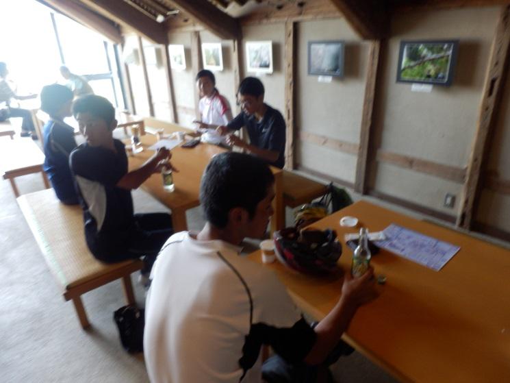夜はキャンプ場の炊事場で合宿の定番,カレー。炊事場は利用料500円。食後に休憩する二年生。