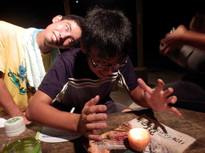 夜はキャンプ場の炊事場で合宿の定番,カレー。炊事場は利用料500円。食後に休憩する二年生。