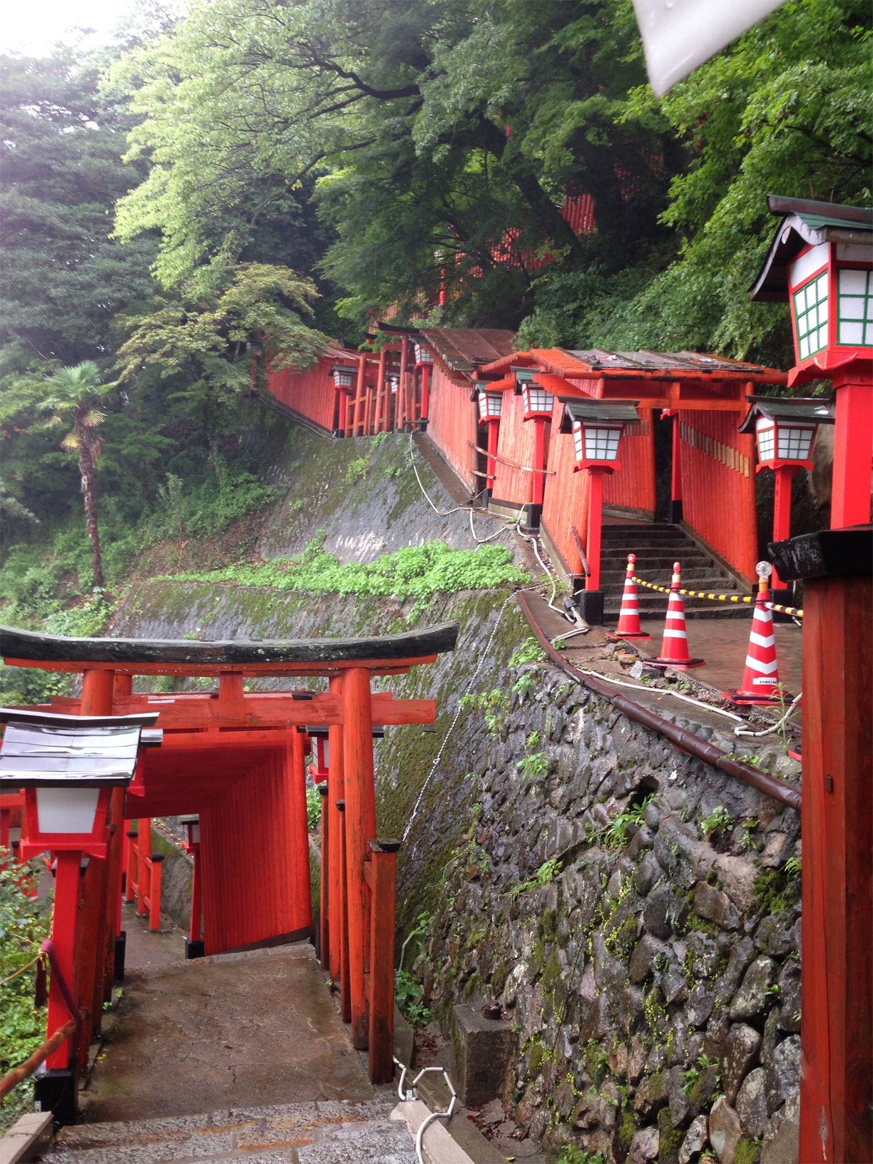 すごい数の鳥居と灯籠です。靄がかかって幻想的でした。雨のおかげで朱色が映えます。