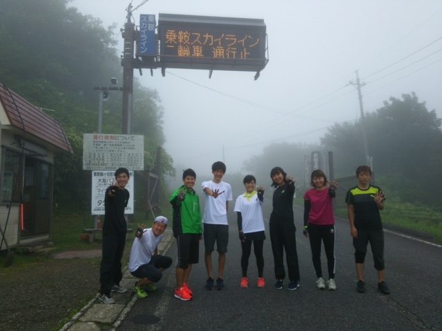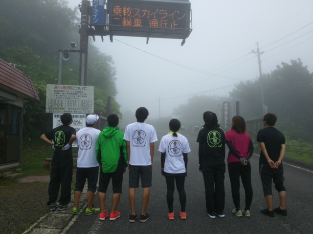 朝食は前日に先輩方が買ってくださっていたパンなどをいただき、この合宿の目玉である乗鞍岳にやっと登れるということで、各々ワクワクしながら、乗鞍スカイライン入口までいきます。この入口までの道もなかなかの山で、ひいひい言いながら登りました。坂が終わる頃には霧が立ち昇っていて、先発組が全員到着。