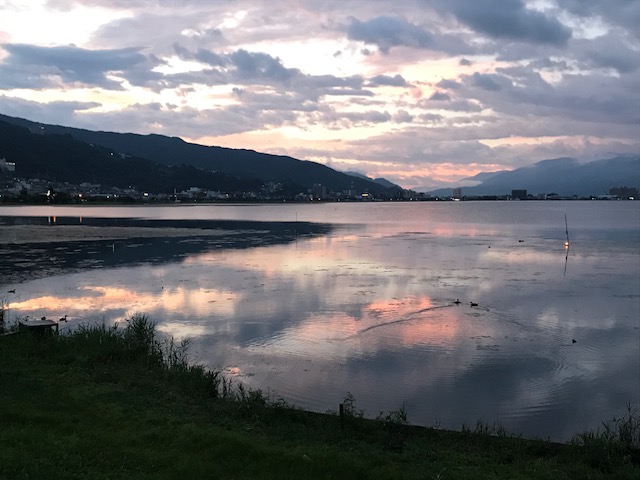 合宿5日目の見どころはビーナスラインです!ネカフェを出る前に、一人早朝の諏訪湖を撮影しに行きました。